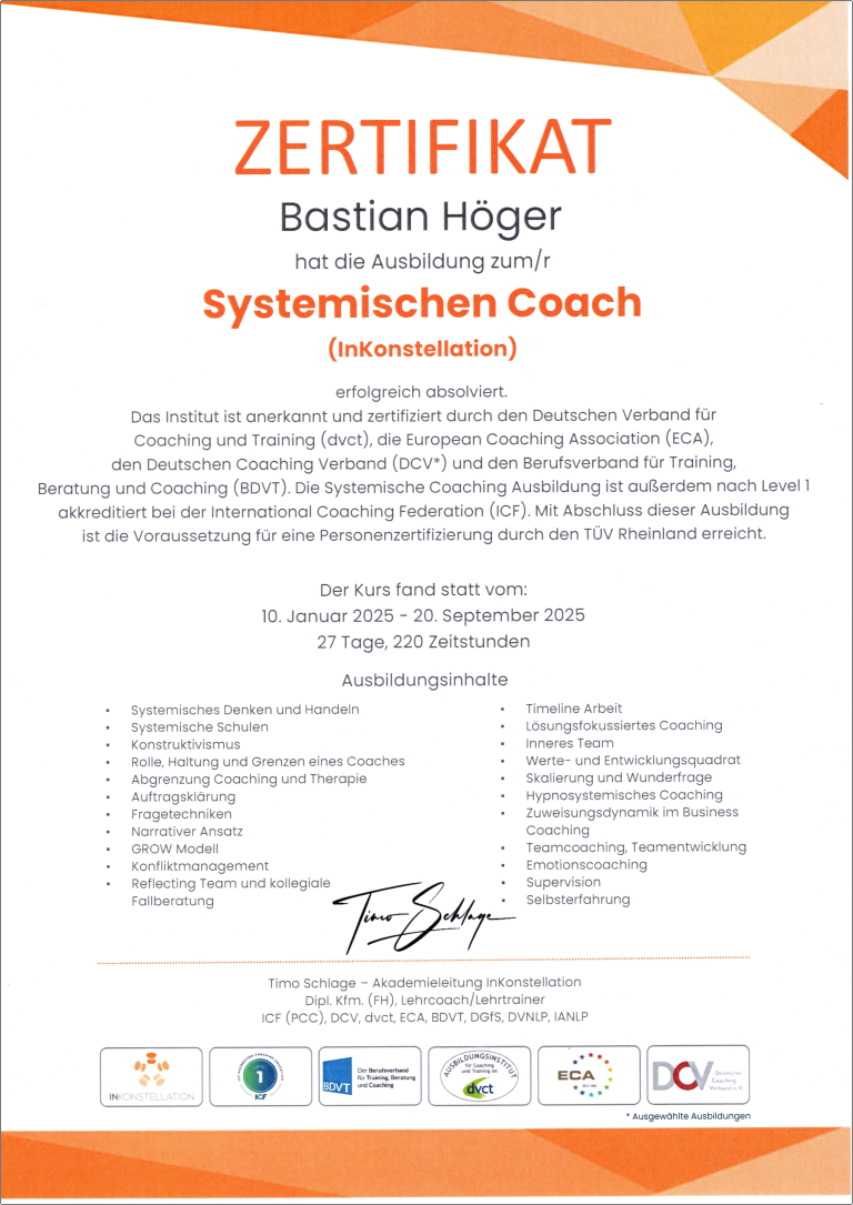 Seit über 20 Jahren setze ich mich intensiv mit persönlichen und beruflichen Umbrüchen auseinander. Prägende Erfahrungen in meiner Familie, eine Phase von Burnout sowie Arbeitslosigkeit führten 2012 zu einem persönlichen Tiefpunkt. Durch systemische Therapie, mentales Training und konsequent ressourcenorientiertes Arbeiten habe ich diese Erfahrungen reflektiert, verarbeitet und in tragfähige Kompetenzen überführt.